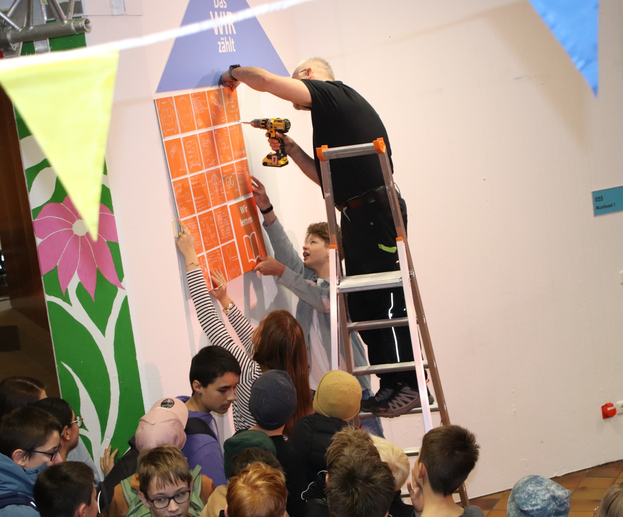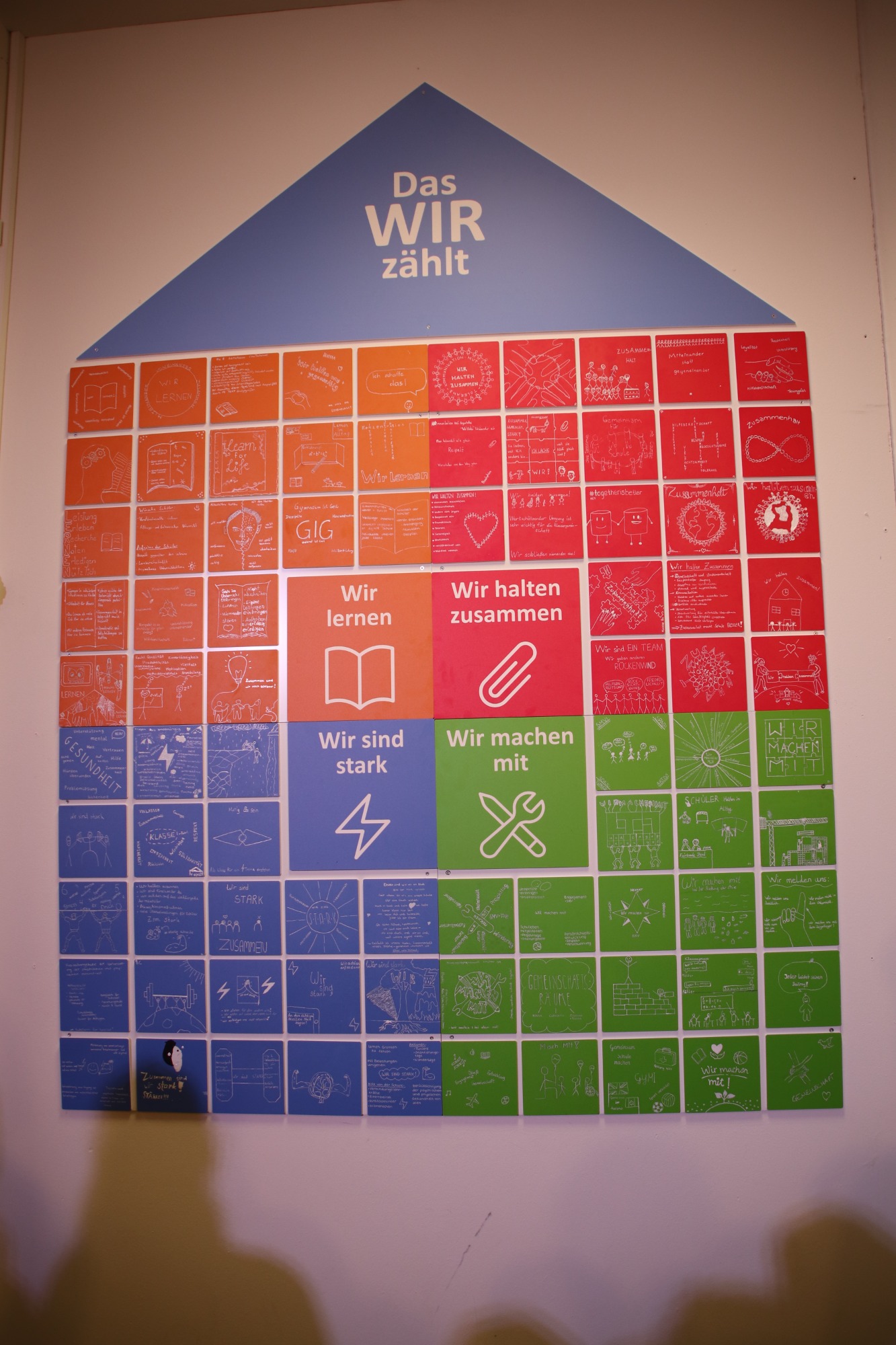 Nach intensiver Arbeit und teils lebhaften Diskussionen über Formulierungen, Symbole und Farben entstand schließlich ein gemeinsames Ergebnis: unser neuer „Kompass“. Dieser wurde als Flyer gestaltet und fasst die zentralen Werte unseres schulischen Miteinanders zusammen. Unter dem Leitspruch „Das WIR zählt“ stehen vier grundlegende Aspekte: Wir lernen. Wir halten zusammen. Wir sind stark. Wir machen mit.