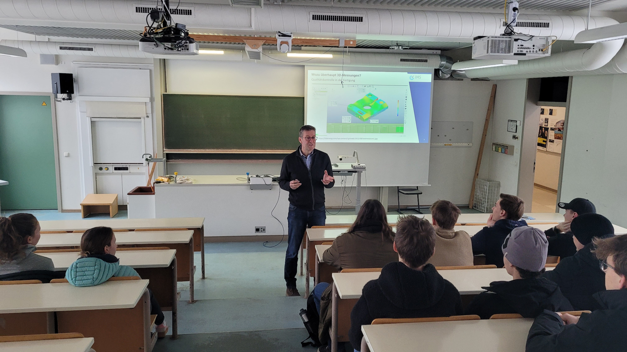Eine Gruppe von Schülerinnen und Schülern der Q12 besuchte am 29.1.2026 die Hochschule Kempten. Nach einer Vorstellung der Hochschule und ihrer Studiengänge durch Prof. Dr. Thomas Eimüller konnten die Schülerinnen und Schüler an einer kurzen Probevorlesung teilnehmen. Prof. Dr. Michael Layh gab ihnen einen Einblick in die optische 3D-Vermessung im Maschinenbau. Mit Hilfe von Laserlicht können z.B. sich schnell bewegende Objekte erkannt werden oder ihre Form abgetastet werden. Bei der anschließenden Laborführung konnten die Schülerinnen und Schüler einige Verfahren selbst ausprobieren.