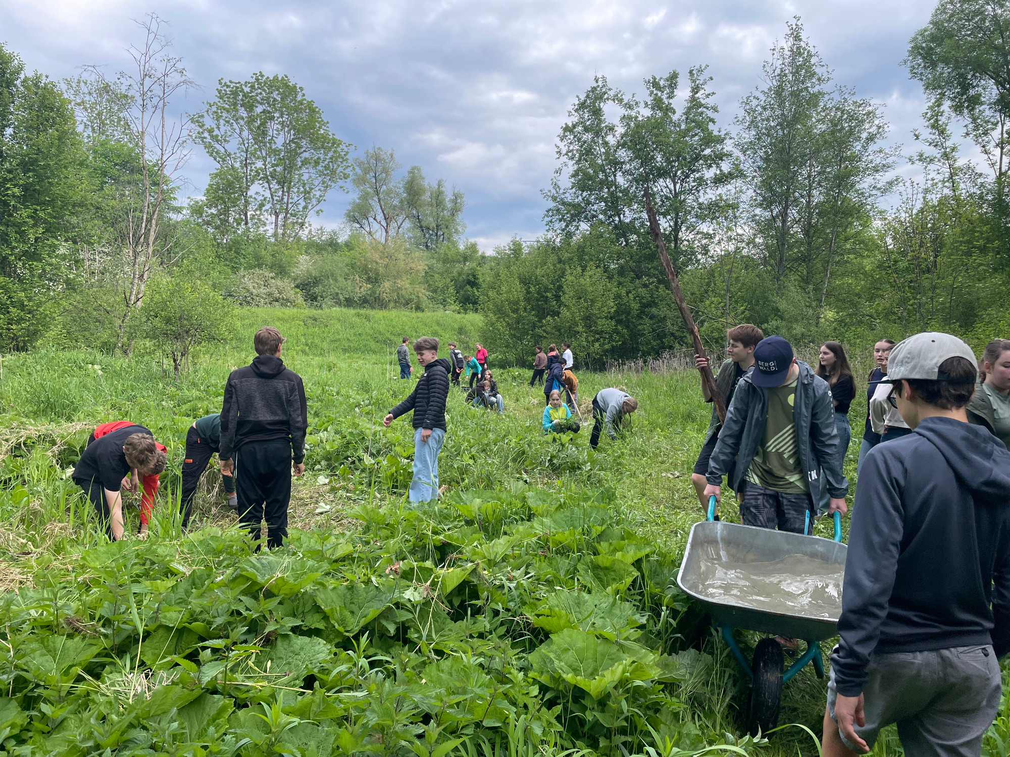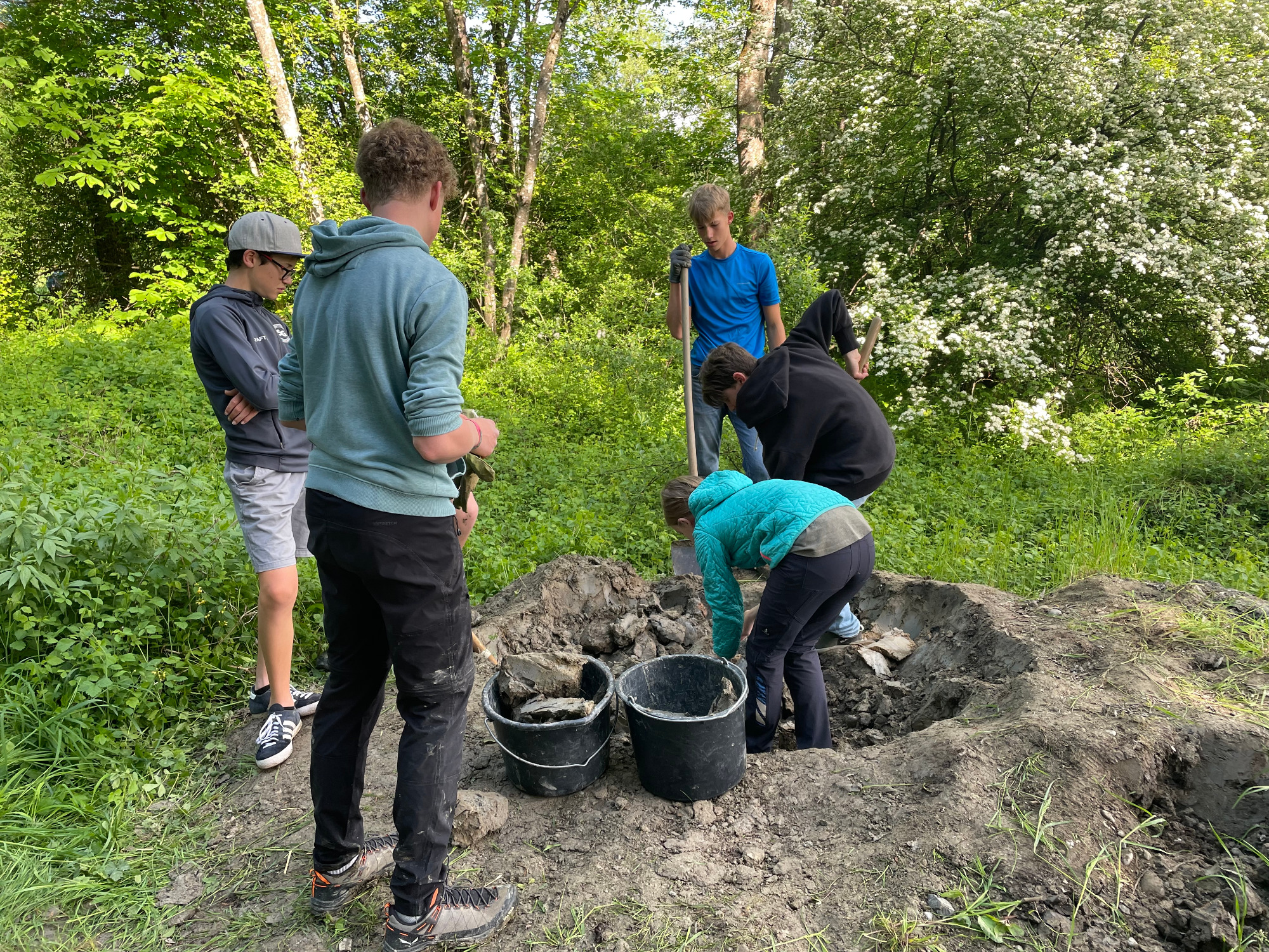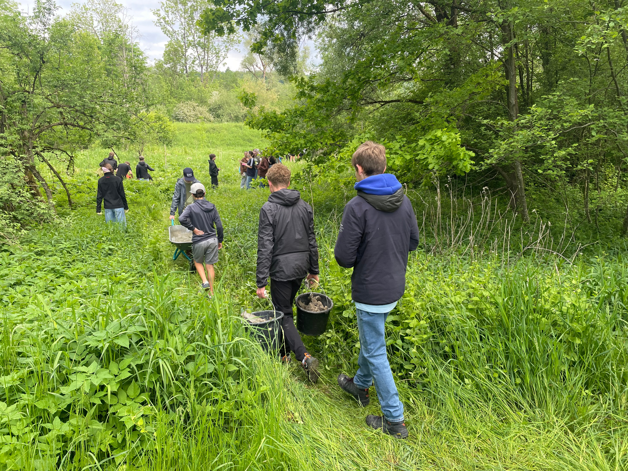 Lernen heißt für unsere Schülerinnen und Schüler oft genug Englisch, Latein, Chemie, Hefteintrag, Vokabelliste… Umso wichtiger ist es, das Lernen inhaltlich und räumlich zu erweitern, also am Projekttag schulische Lernorte mit anderen Inhalten zu bereichern und außerschulische Lernorte zu begreifen. Für die Mittelstufe standen die Angebote unter dem Leitfach Geschichte. Während die 9. Klassen die KZ-Gedenkstätte in Dachau besuchten, konnten die 10. Klassen die NS-Vergangenheit hier vor Ort im Alpenstadtmuseum und an der Ordensburg Sonthofen unter fachkundiger Leitung von Herrn Klein erfahren. Eine Vorstellung der Theaterwerkstatt Augsburg für die 11. Klassen wiederum griff das Thema Antisemitismus auf – ein Projekt, das sich mit der Förderung durch den Bezirk Schwaben realisieren ließ. Mit Herrn Weberstätter von der Bundespolizei erlebten die 8. Klassen einen Workshop zum Thema Zivilcourage im Netz; Jugendliche sind sich oft nicht bewusst, wie schnell sie eine strafbare Handlung mit dem allgegenwärtigen Handy begehen können und unterschätzen die Folgen. Deshalb werden die Schülerinnen und Schüler für das Thema sensibilisiert und für einen couragierten Einsatz gewappnet, wenn z.B. ein Klassenchat auf die schiefe Bahn gerät. Einen körperlichen Ausgleich gab es dann im zweiten Teil beim Einsatz für die Gelbbauchunken, für die sie angeleitet durch Frau Mader vom Bund Naturschutz tatkräftig neue Refugien in der Nähe der Rauhenzeller Seen erschufen.