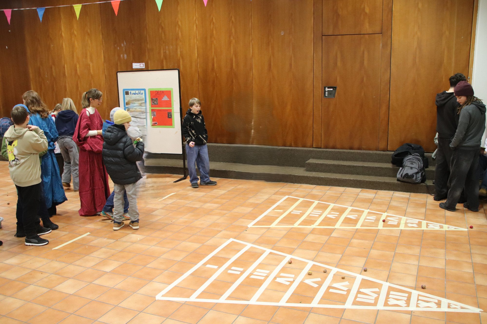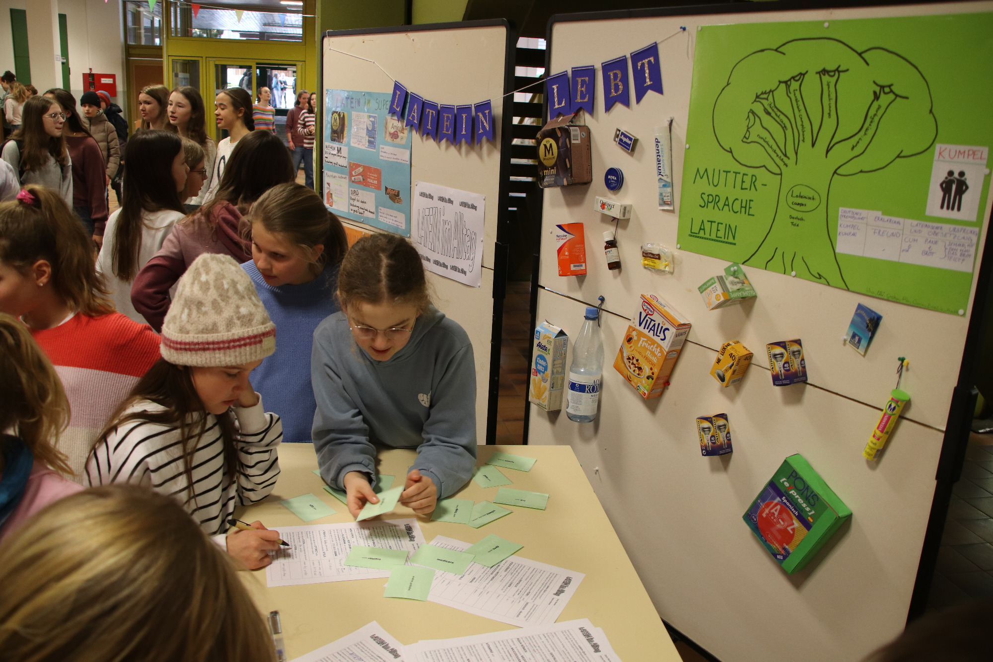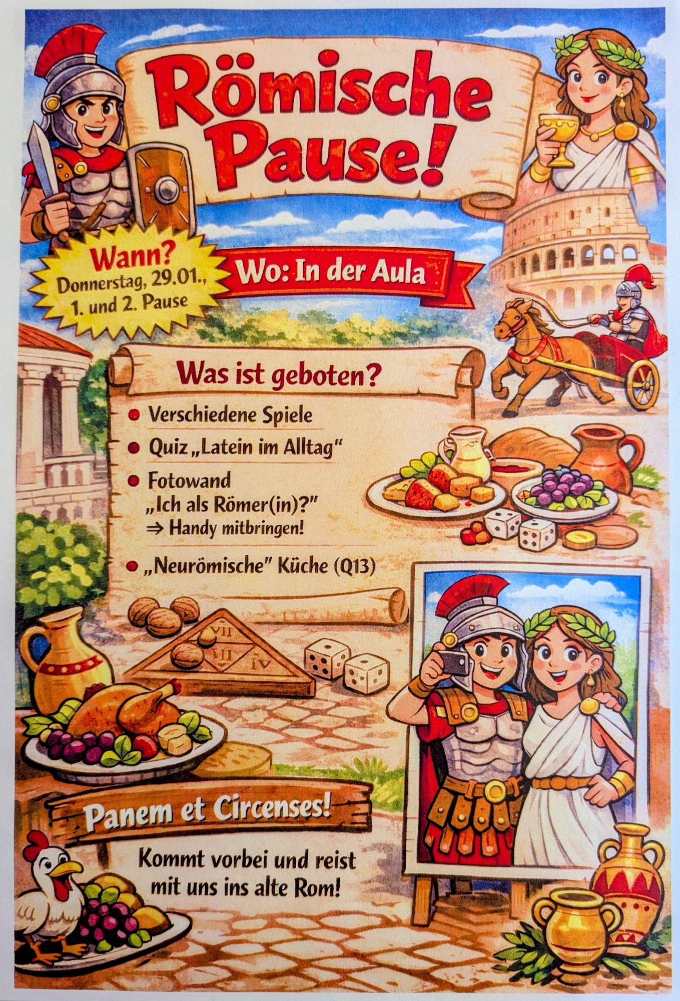 Tief eintauchen in die Welt der griechisch-römischen Antike konnten die Schülerinnen und Schüler des Gymnasiums am 29. Januar 2026. An diesem Donnerstag veranstaltete die Fachschaft Latein erstmals eine „Römische Pause“ und lud dazu ein, eine Zeitreise in die römische Vergangenheit zu unternehmen – in die Welt der Gladiatorenkämpfe und Wagenrennen, der mythischen Helden und alten Götter, in die Welt der lateinischen Sprache. Gemäß dem Motto „Panem et circenses – Brot und Spiele“ konnten die Schülerinnen und Schüler in der Aula bei mehreren Geschicklichkeitsspielen sowie kleinen Quiz- und Rätselaufgaben, durch viele Informationsplakate, durch eine Fotowand im römischen Kleidungsstil und bei allerlei „neurömischen“ Leckereien in die Welt des alten Rom hineinschnuppern.