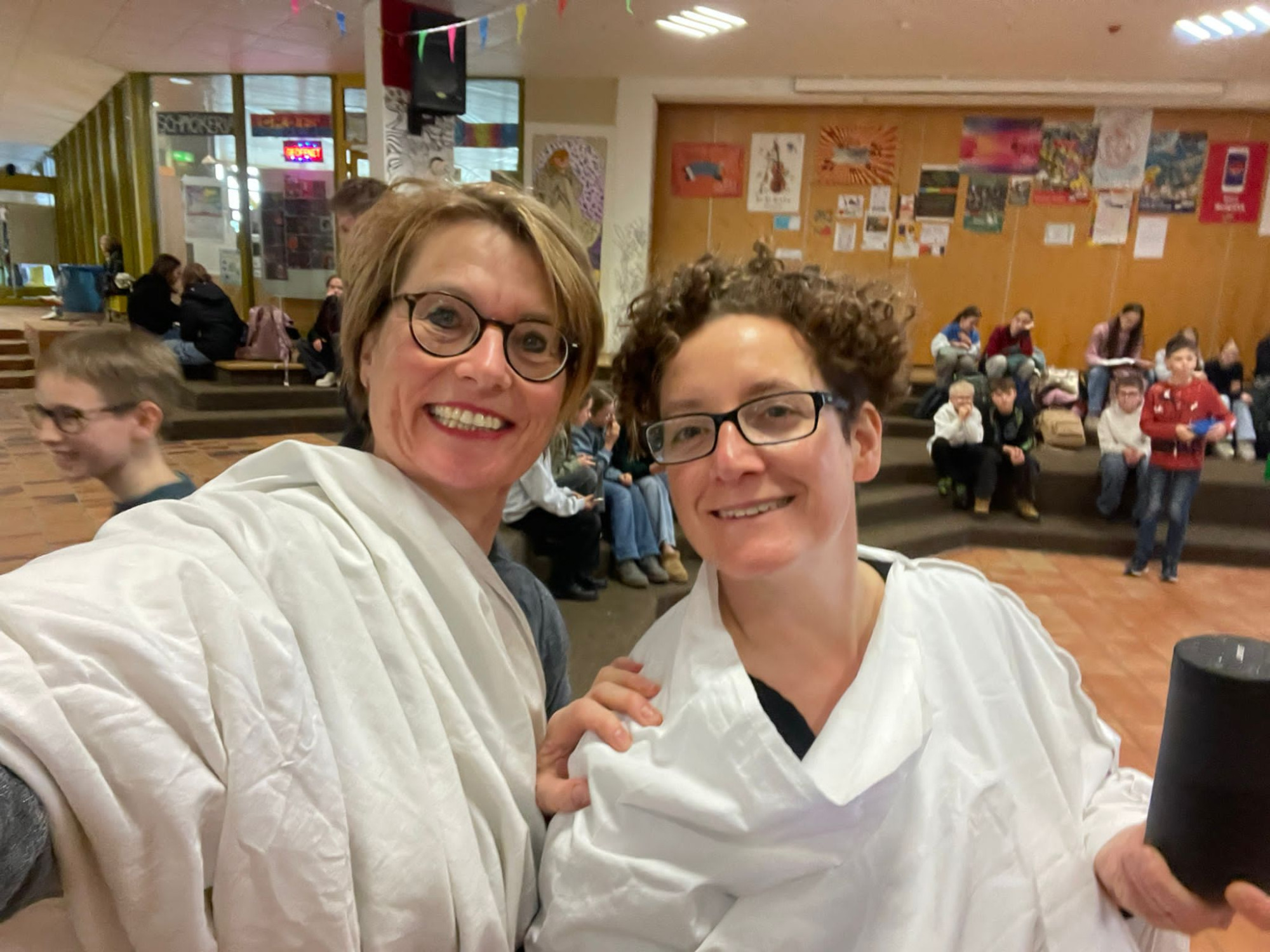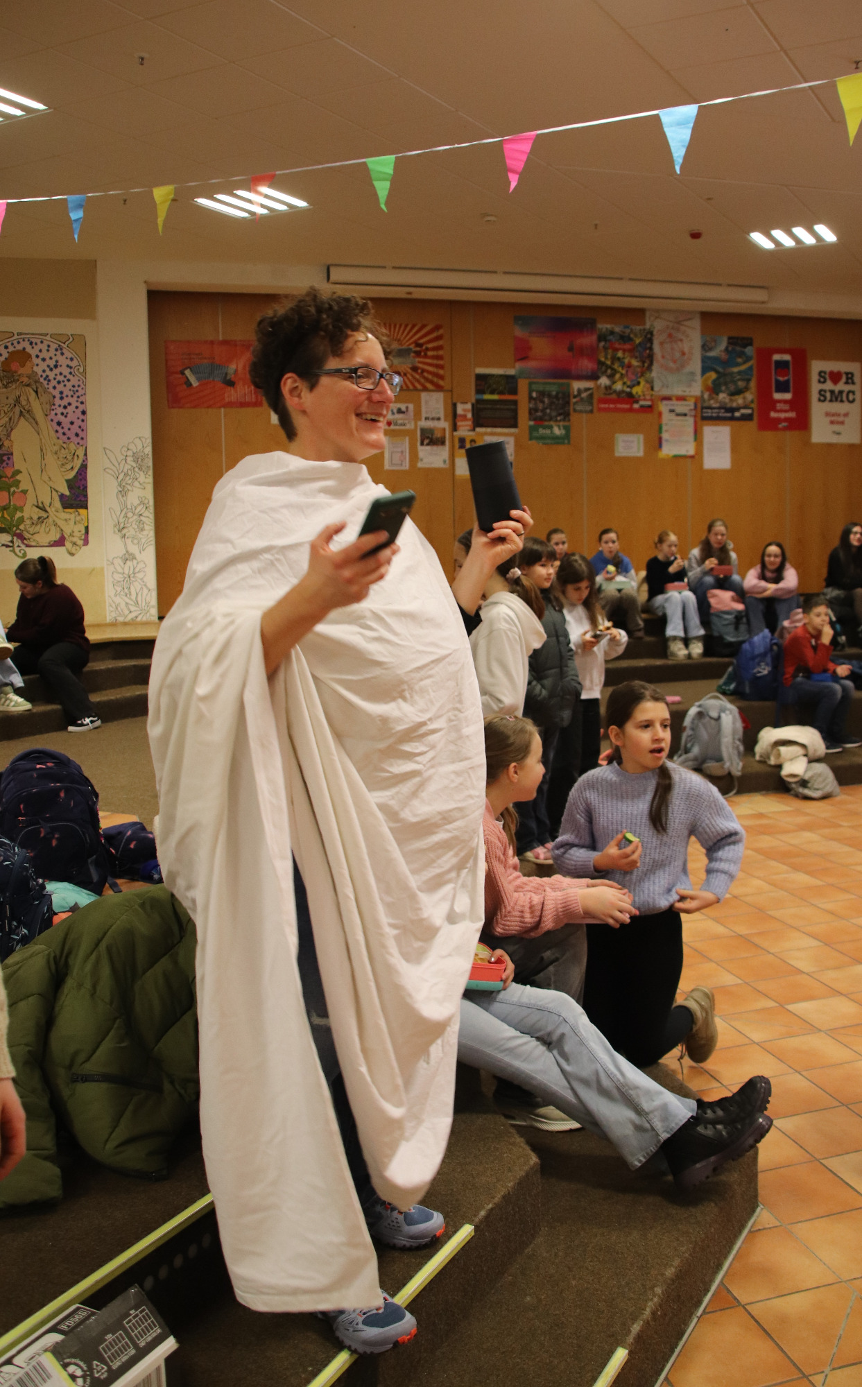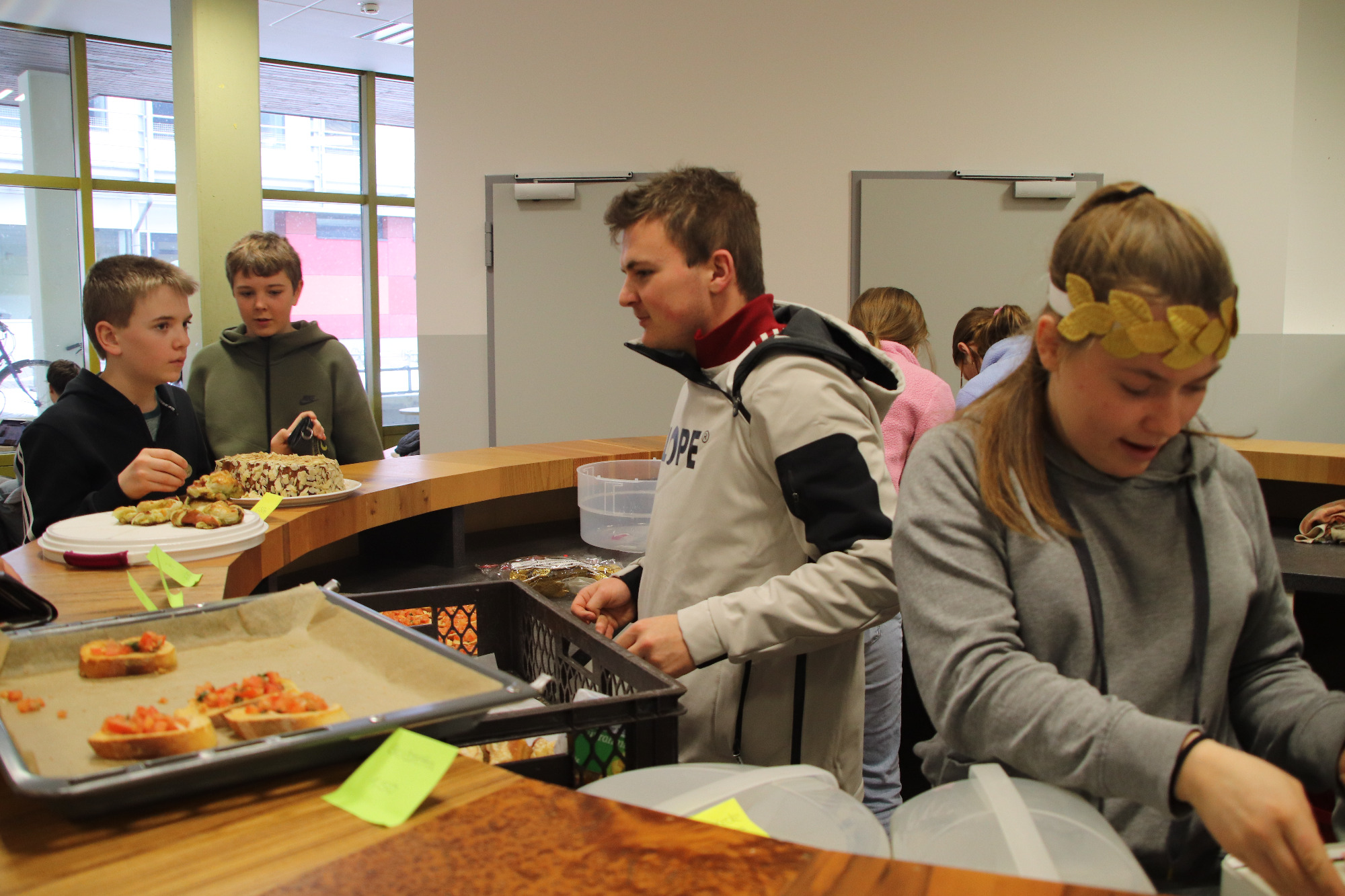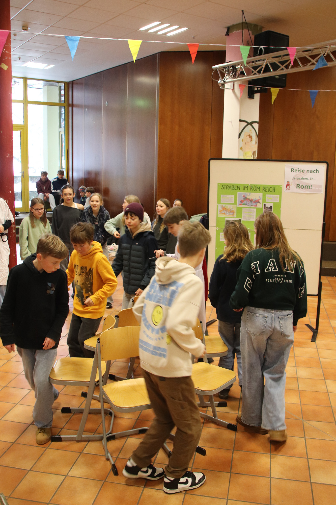 Tief eintauchen in die Welt der griechisch-römischen Antike konnten die Schülerinnen und Schüler des Gymnasiums am 29. Januar 2026. An diesem Donnerstag veranstaltete die Fachschaft Latein erstmals eine „Römische Pause“ und lud dazu ein, eine Zeitreise in die römische Vergangenheit zu unternehmen – in die Welt der Gladiatorenkämpfe und Wagenrennen, der mythischen Helden und alten Götter, in die Welt der lateinischen Sprache. Gemäß dem Motto „Panem et circenses – Brot und Spiele“ konnten die Schülerinnen und Schüler in der Aula bei mehreren Geschicklichkeitsspielen sowie kleinen Quiz- und Rätselaufgaben, durch viele Informationsplakate, durch eine Fotowand im römischen Kleidungsstil und bei allerlei „neurömischen“ Leckereien in die Welt des alten Rom hineinschnuppern.
