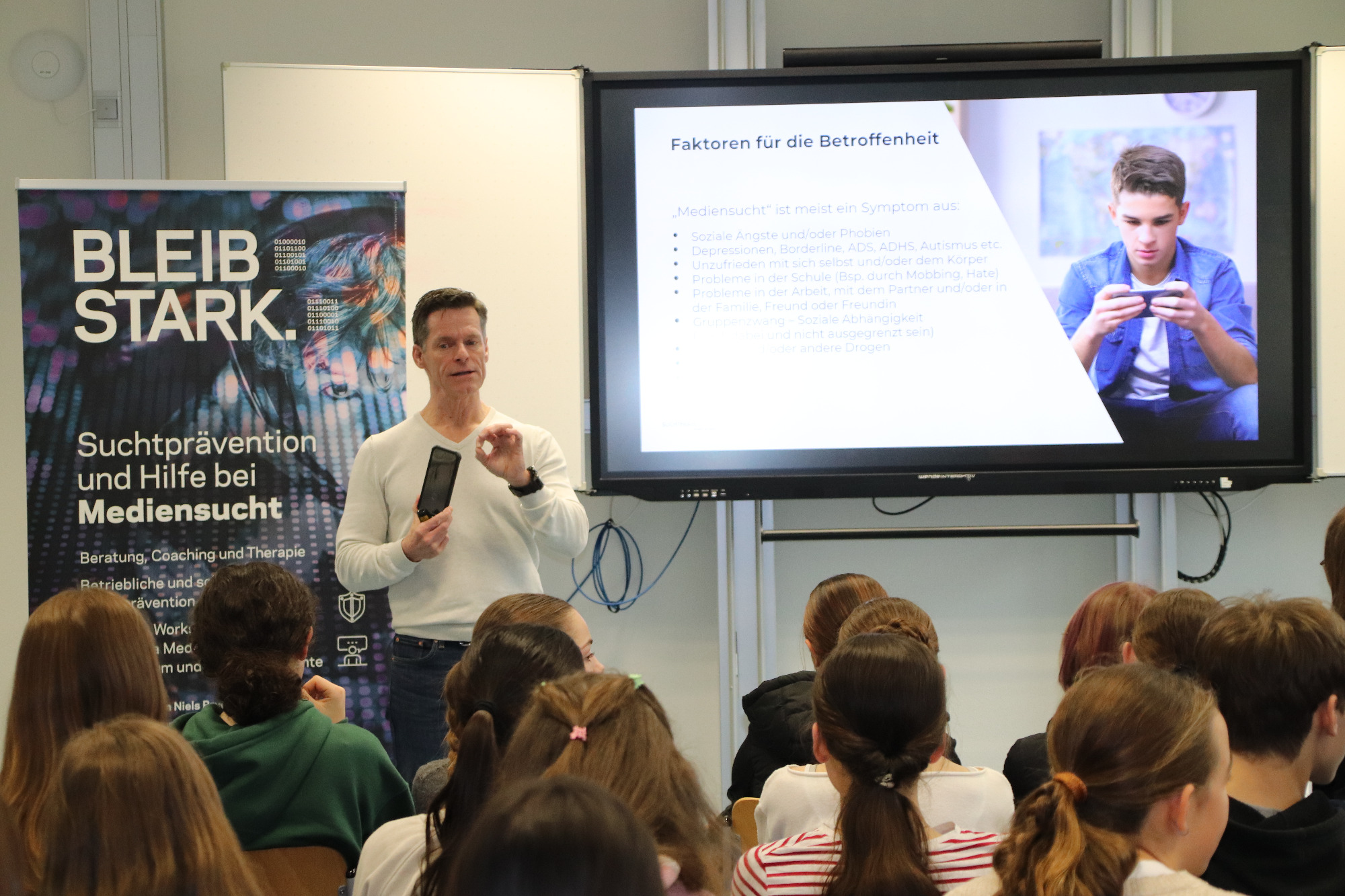 Um hier mit professionellen Tipps und Hilfestellungen unterstützen zu können, hat das Gymnasium Immenstadt den Suchttherapeuten und Sozialpädagogen Niels Pruin aus Augsburg zum Thema „Problematischer Medienkonsum von Kindern und Jugendlichen“ eingeladen.